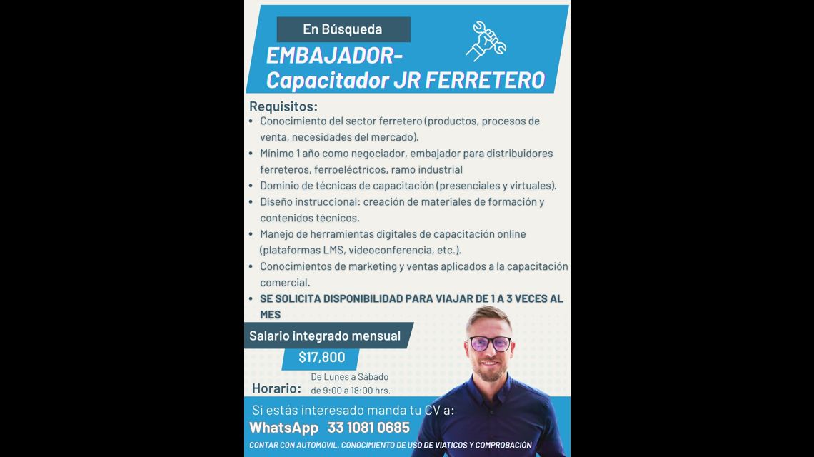 Mínimo 1 año como negociador, embajador para distribuidores ferreteros, ferroeléctricos, ramo industrial